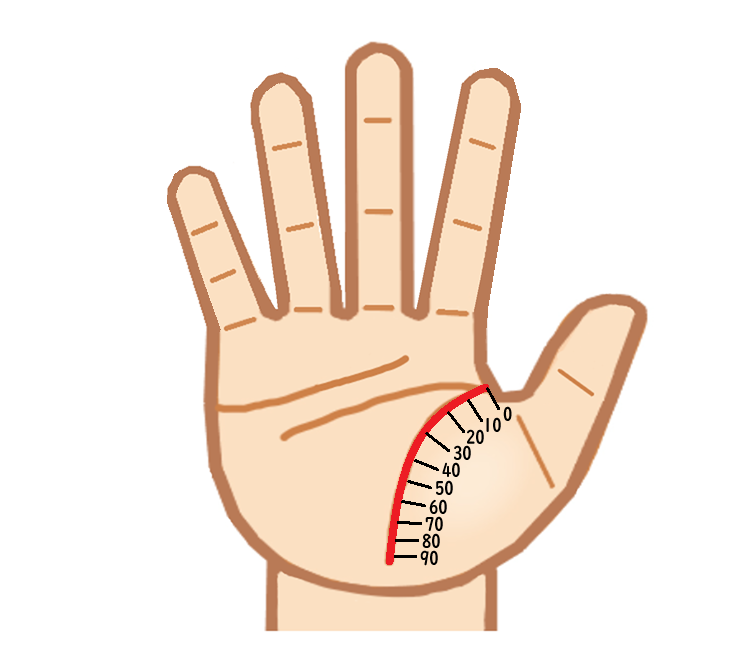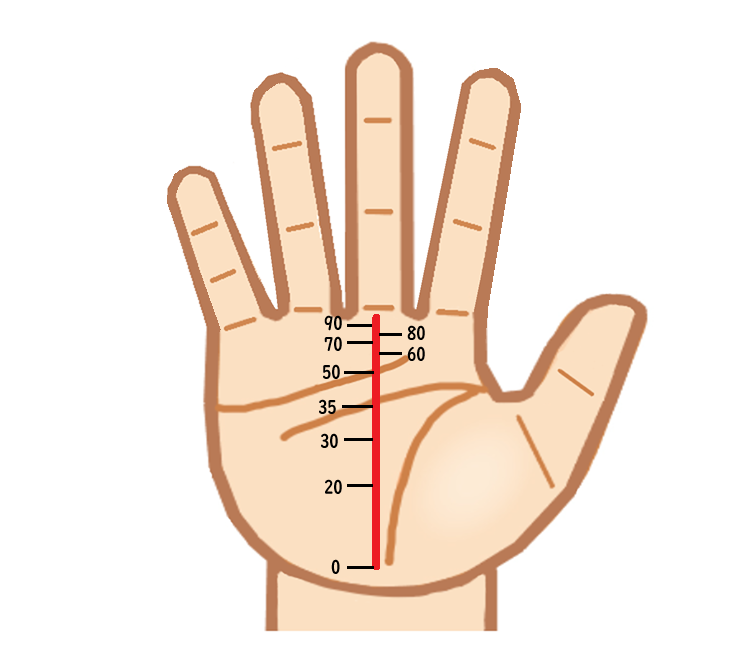 生命線の場合、親指と人差し指の間が起点となり、起点が0歳代で手首に近い部分が90歳代となります。起点から手首の方向に進むにつれ、年齢が上がっていきます。